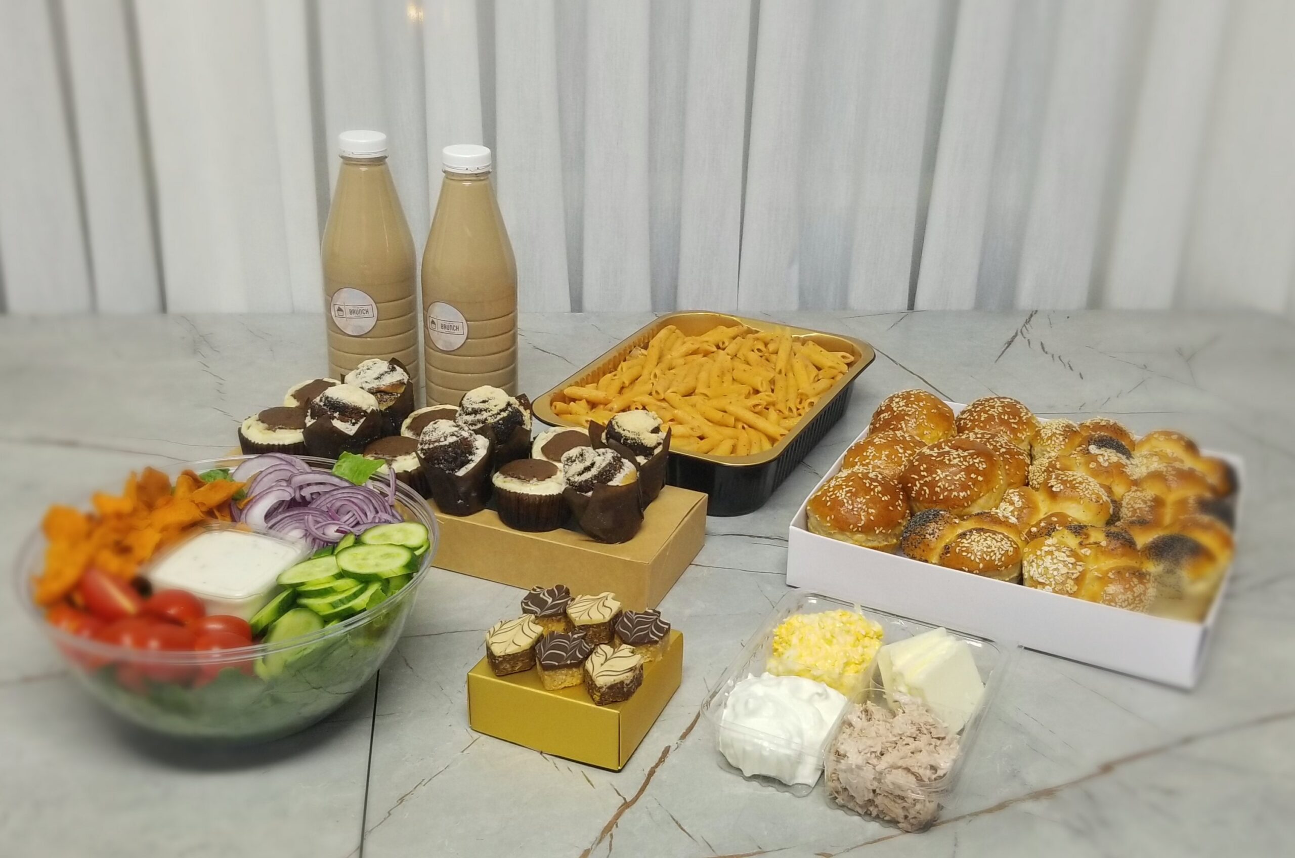 Includes: assortment of 15 rolls (white & whole wheat), platter of spreads, 9×13 penne pasta, family‑size Caesar salad, 6 dreidel‑shaped peanut chews, a dozen assorted pastries, 2‑liter iced coffee (6–10 servings).